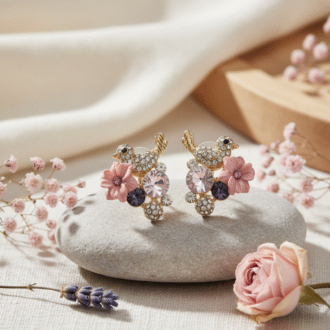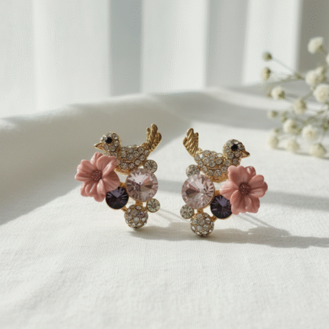Gold-Plated Bird & Flower Stud Earrings for Women – Pink & Clear Crystal Stylish Studs