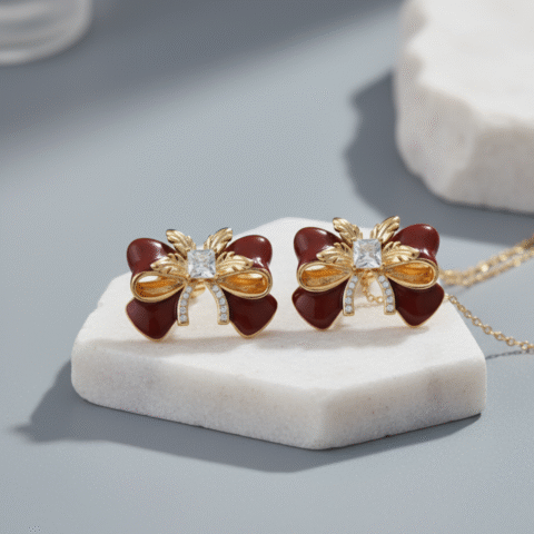 Gold-Plated Red Bow Stud Earrings with CZ Stone – Elegant Enamel Designer Studs