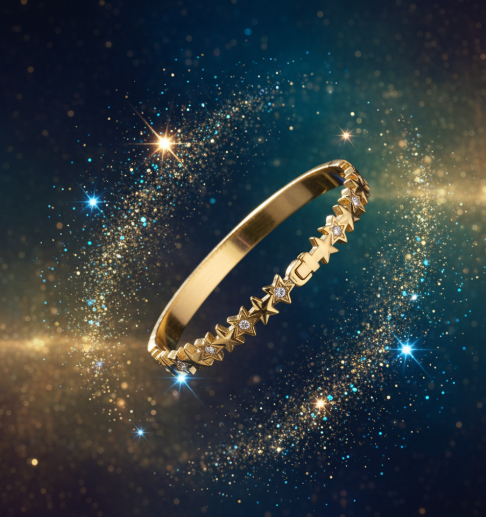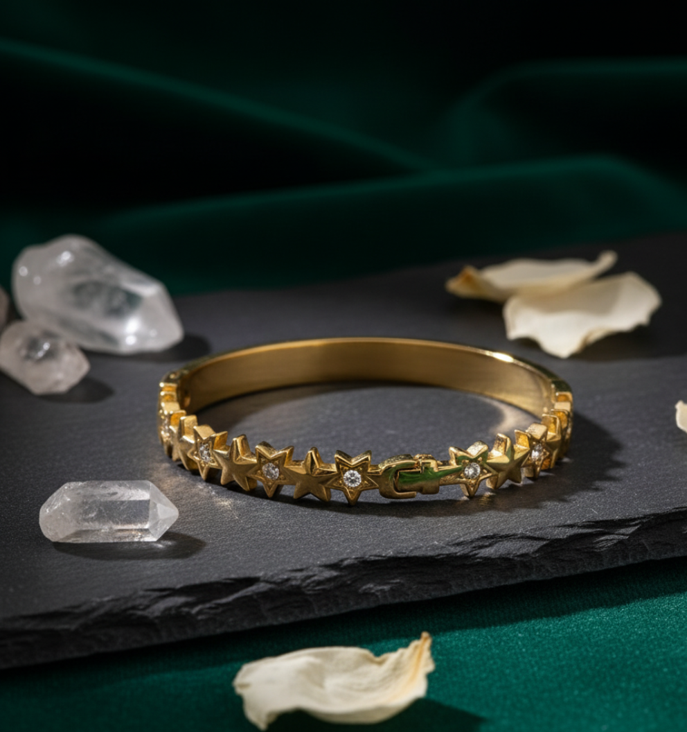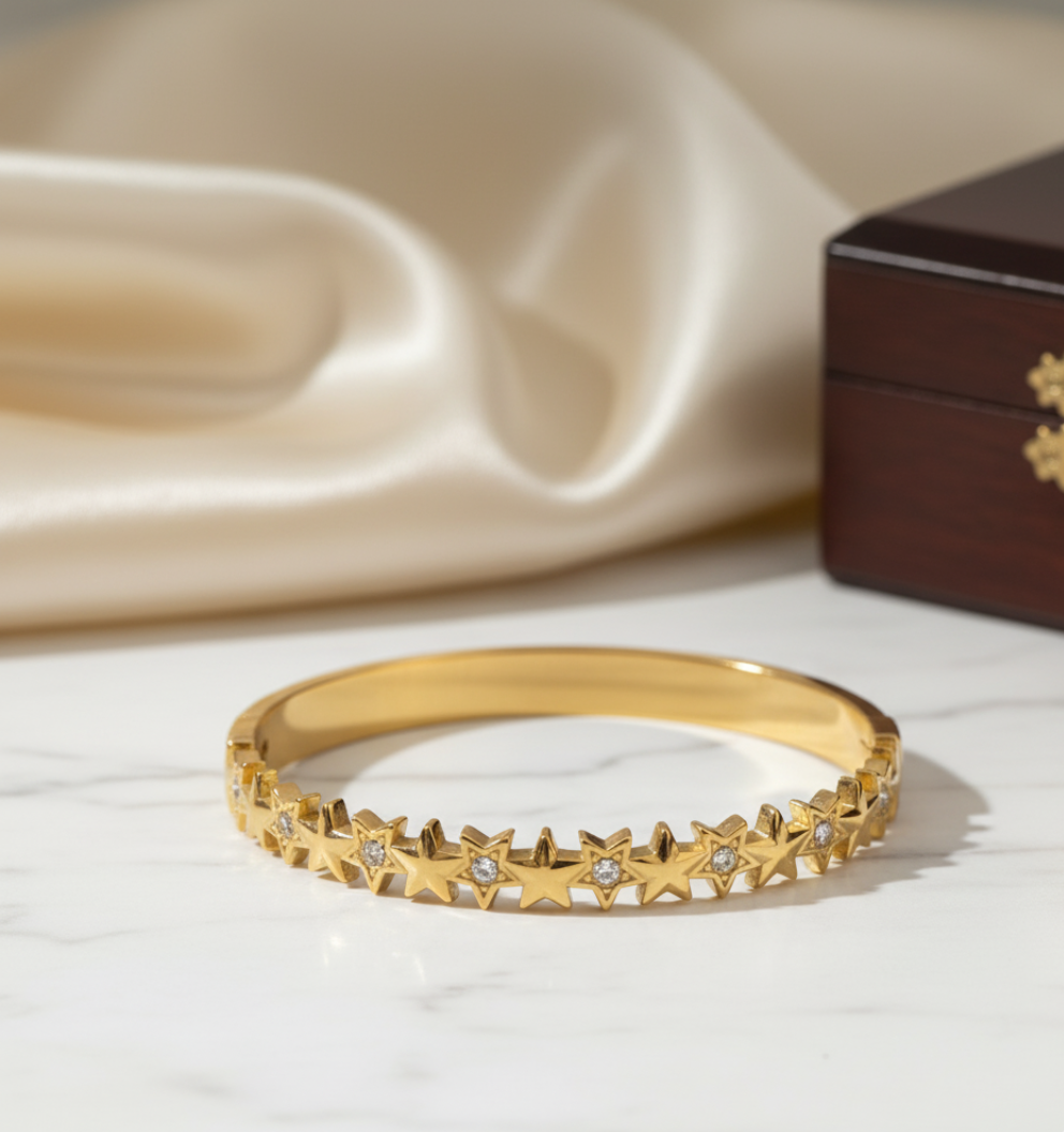 Star Bangle Bracelet for Women crafted in premium stainless steel with durable gold plating and sparkling AD studded star motifs. Tarnish-free, skin-safe, and perfect for daily wear or gifting. A trendy, elegant accessory that adds a radiant touch to any outfit.