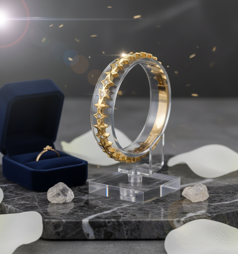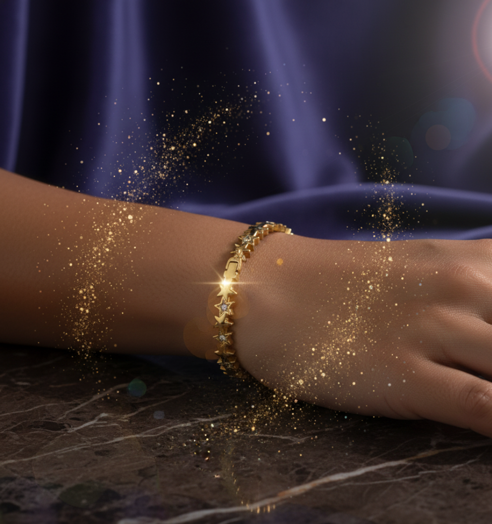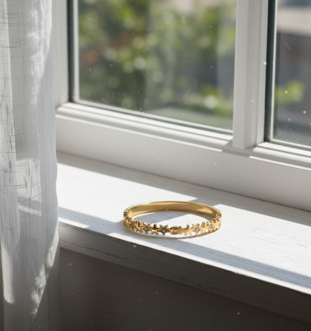 Star Bangle Bracelet for Women crafted in premium stainless steel with durable gold plating and sparkling AD studded star motifs. Tarnish-free, skin-safe, and perfect for daily wear or gifting. A trendy, elegant accessory that adds a radiant touch to any outfit.