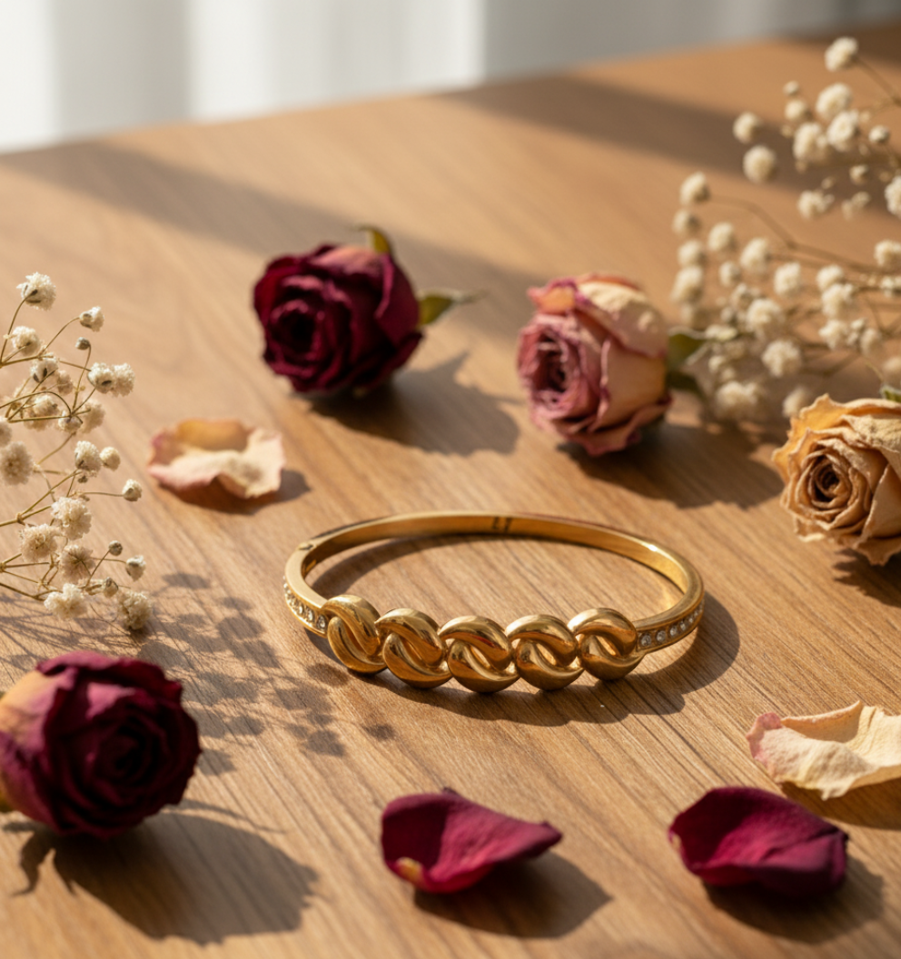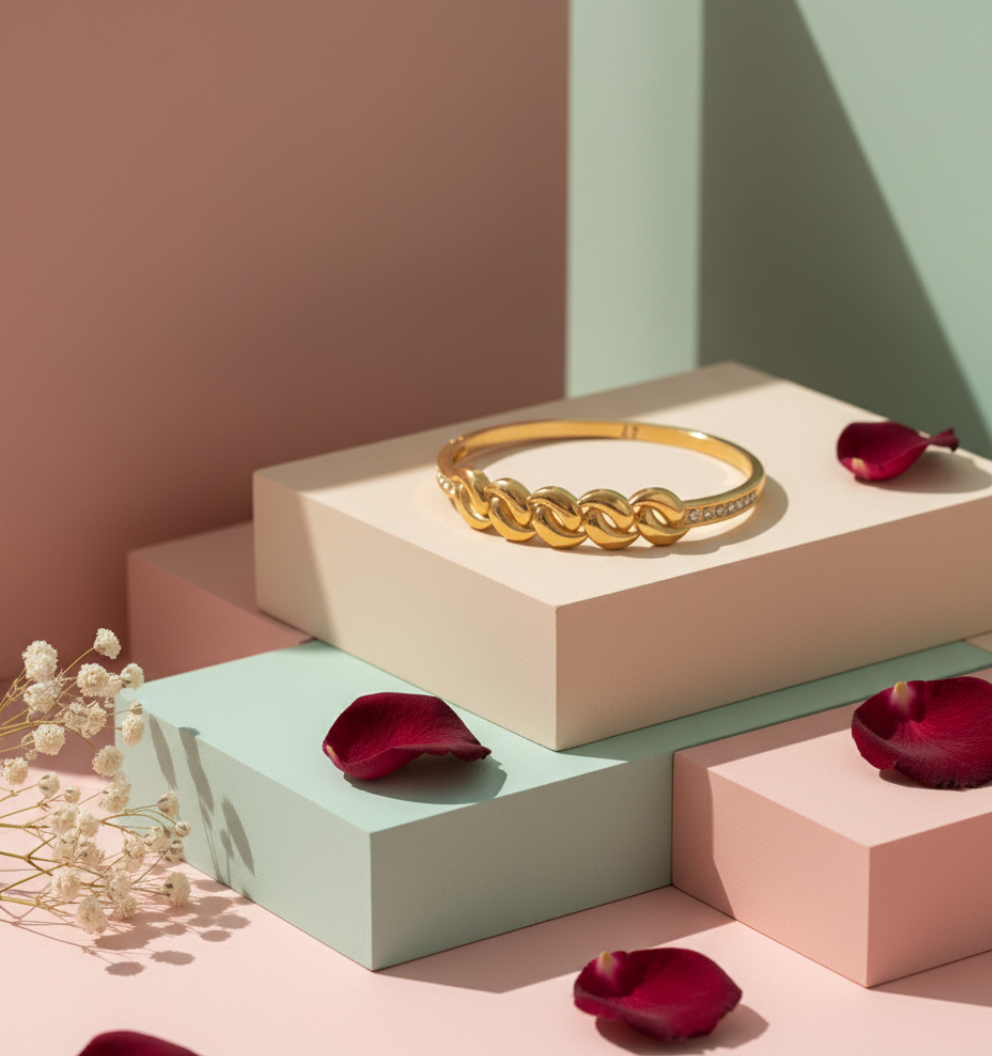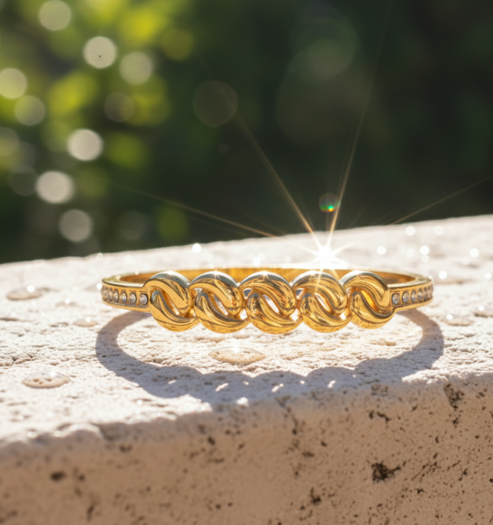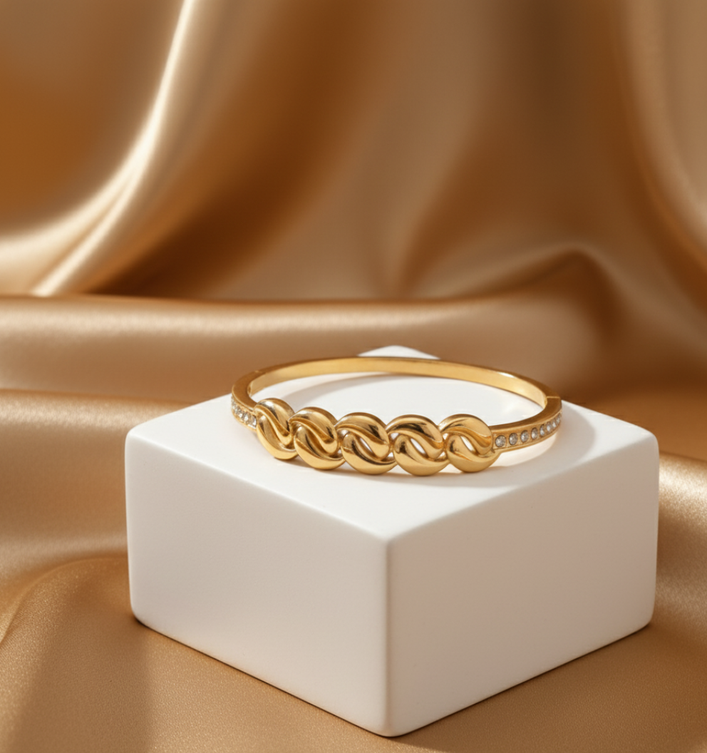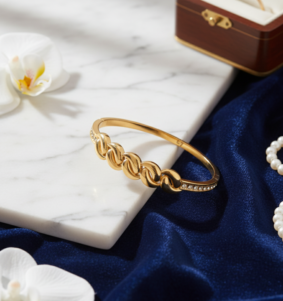 This elegant gold-toned bracelet features a bold chain-link centerpiece with sparkling AD stones on the sides. Crafted from premium stainless steel with an anti-tarnish finish, it offers lasting shine and durability. Perfect for daily wear, gifting, or elevating any outfit with a stylish, modern touch.
